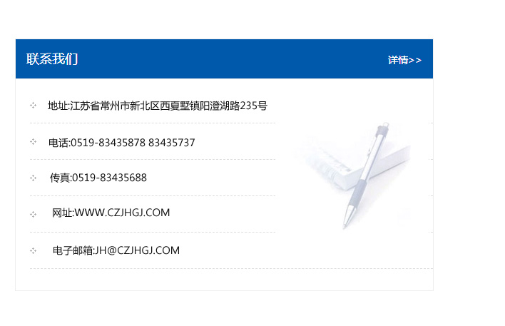 地址:常州市新北區友邦商務大廈1幢16、17層  電話:0519-85101652  傳真:0519-85112595  郵編:213022  網址:www_cz-jiayue_cn.dayang-nets.com  郵箱:xiajifengaa@163.com